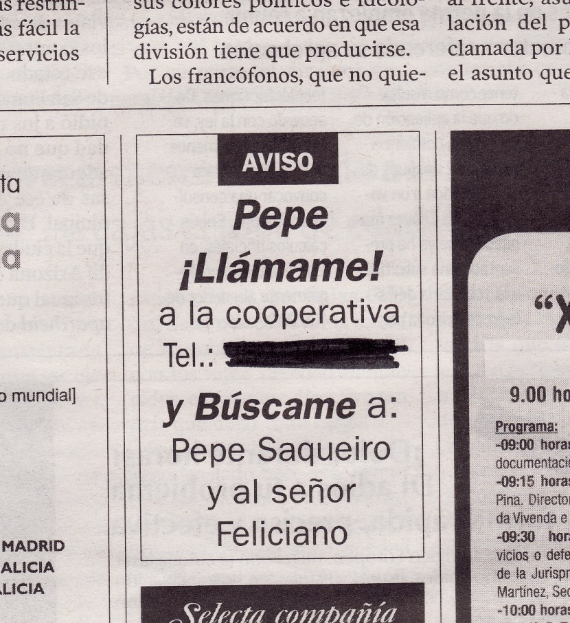Aporto como prueba este grito urgente de alguien que, dejando a un lado todo lo que ha pasado en telecomunicaciones desde la generalización del teléfono móvil, apelaba a la presencia de su compadre Pepe con una rotunda inserción en plena sección Internacional de La Voz de Galicia, el pasado viernes 30 de abril