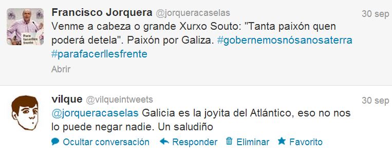 Estamos en vísperas de elecciones autonómicas en Galicia y el País Vasco. Vamos a tener una jornada de reflexión para que los señores en el aperitivo se digan unos a otros «nada, aquí estamos… reflexionando» y por la tarde se encuentren de paseo y comenten «qué, iremos para casa que hay que reflexionar, no?». Es el momento de mostrar una serie de acercamientos en Twitter que he llevado a cabo para descubrir a la persona que se esconde detrás de cada político y de cada jerarca. El lado humano. Detrás de esas pesadas estructuras que son los partidos, de sus siglas que a veces dan risa y de los logos pixelados de sus juventudes hay personas como tú y como yo, que se lían al coger las rotondas y que también tienen en casa dibujos enmarcados de saxofonistas negros que ponen «Harlem» y «Jazz».